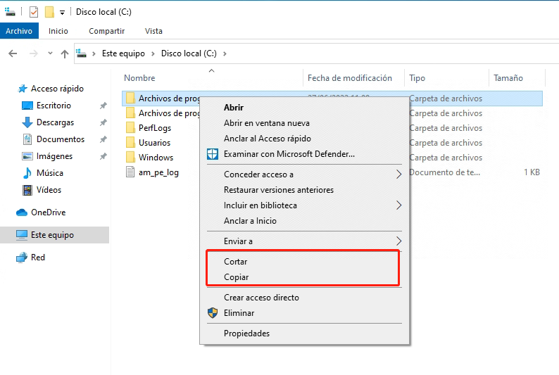 Paso 2. Navega hasta las carpetas o archivos que quieras mover, haz clic con el botón derecho del ratón y selecciona Copiar o Cortar en las opciones dadas.