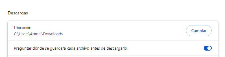 - En la sección Descargas, activa la opción Preguntar dónde guardar cada archivo antes de descargarlo.