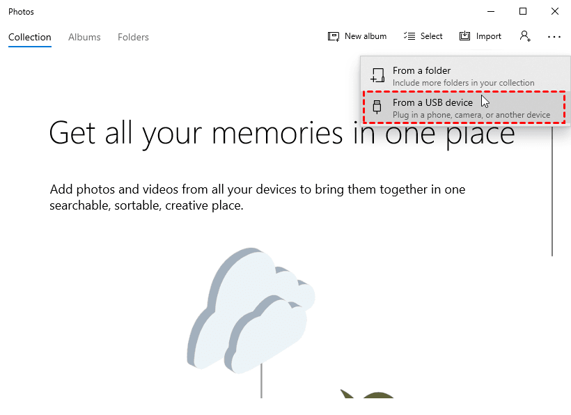 2. Haz clic en "Importar" en la esquina superior derecha de la aplicación Fotos y luego selecciona "Desde un dispositivo USB".