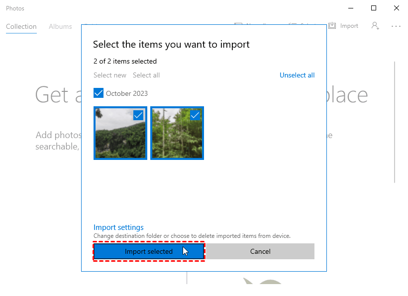 Las fotos se importarán por defecto a la carpeta "Imágenes" en tu computadora. Para guardarlas en otra carpeta, puedes hacer clic en "Configuración de importación" > "Cambiar el destino de la importación".