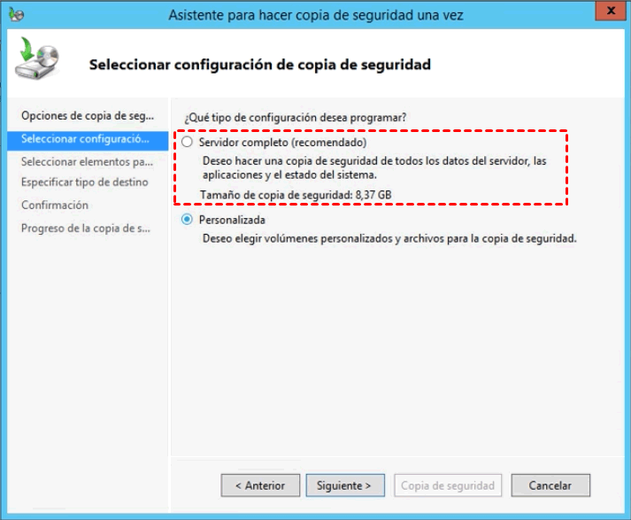 Paso 3. Elija la opción Servidor completo en esta ventana y haga clic en Siguiente. Contiene todos los datos del servidor, las aplicaciones y el estado del sistema, por lo que puede utilizarlo para realizar una recuperación completa del sistema junto con la recuperación del estado del sistema.