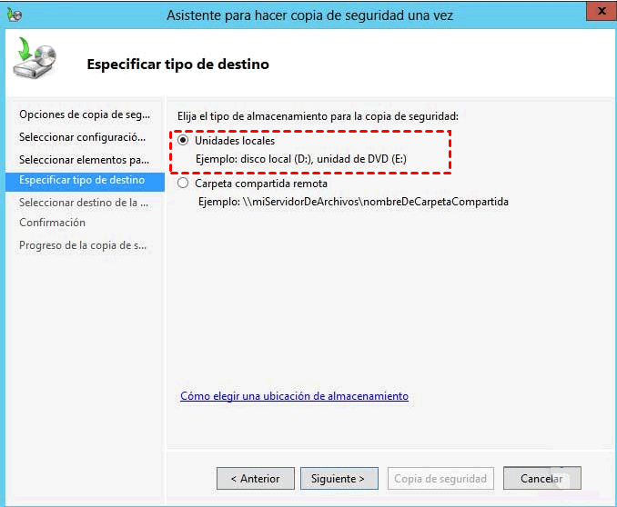 Paso 4. Seleccione la ruta de destino para guardar su copia de seguridad. Puedes elegir cualquier unidad local o guardar en una red compartida.