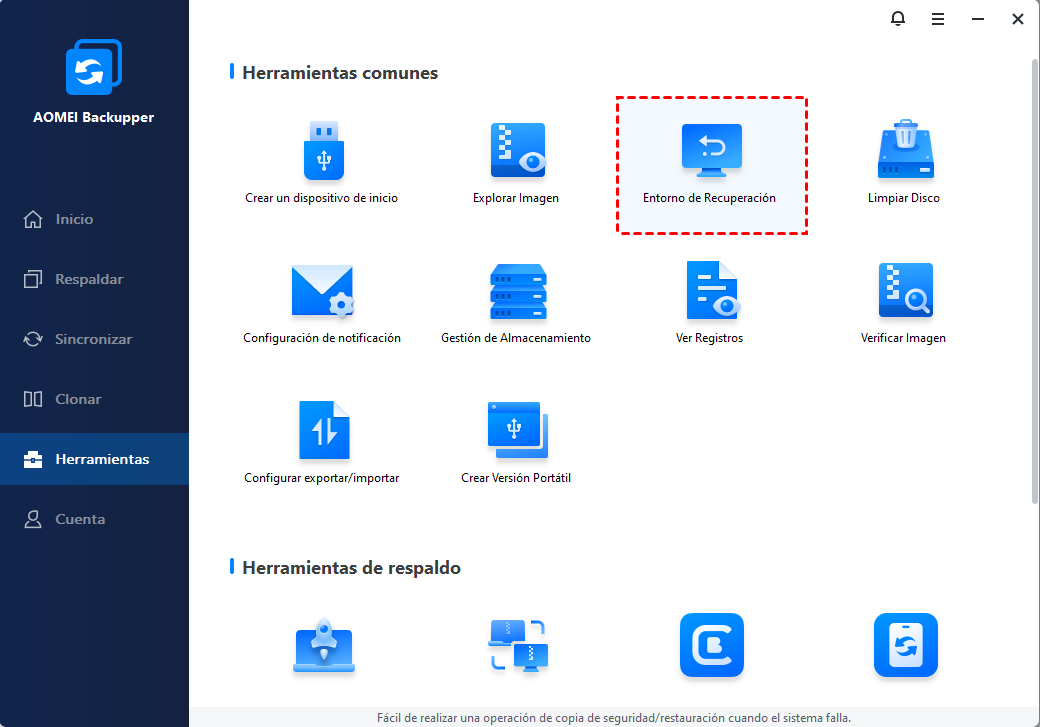 - Si actualizas a AOMEI Backupper Professional o ediciones superiores, puedes crear un entorno de recuperación especial para realizar copias de seguridad/restauración sin iniciar Windows. Solo ve a Herramientas > Entorno de recuperación para habilitarlo.