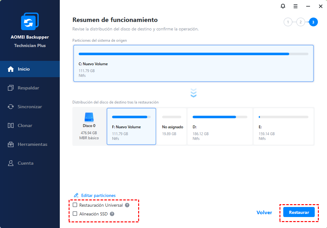 4. El programa seleccionará automáticamente la(s) unidad(es) original(es) del sistema como lugar de destino. Haga clic en "Restaurar" después de su confirmación.