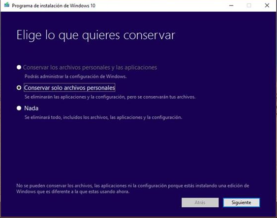 Al usar la Instalación de Reparación, puedes elegir instalar Windows 10 manteniendo todos los archivos personales, aplicaciones y configuraciones, manteniendo sólo los archivos personales o no manteniendo nada.