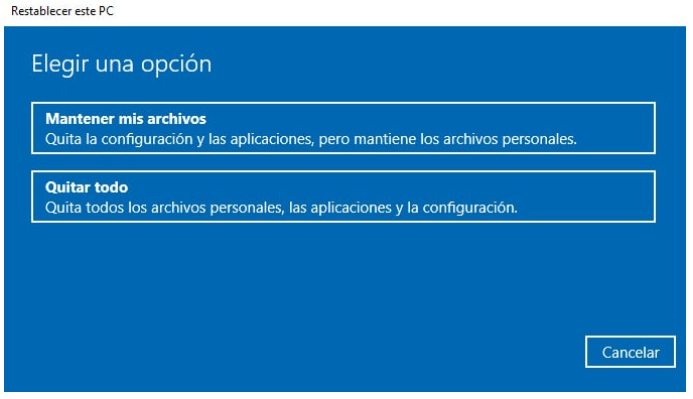 2. Después de seleccionar Reiniciar este PC, tienes dos opciones, "Mantener mis archivos" y "Quitar todo", selecciona la primera opción. Esto eliminará las aplicaciones y la configuración, pero mantendrá tus archivos personales donde están.