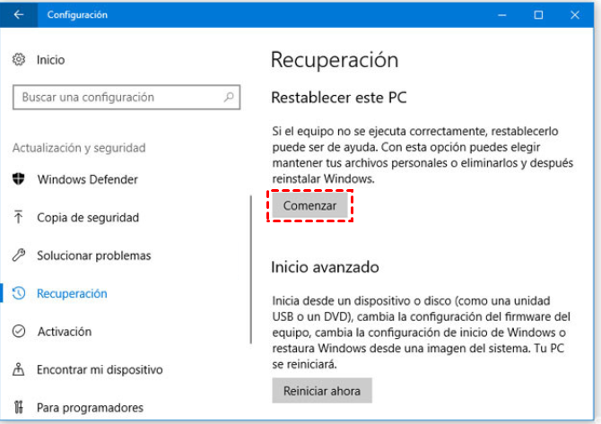 >> Si se trata de un ordenador que funciona y todavía puede arrancar, vaya a Configuración > Actualización y Seguridad > Recuperación > Restablecer este PC y seleccione Empezar en la opción Restablecer este PC.