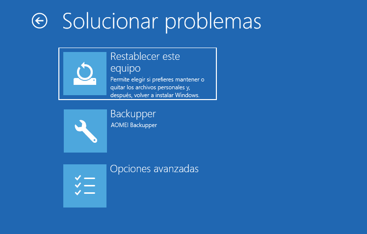 >> Si no, puedes crear una unidad de recuperación y arrancar desde ella. A continuación, elija la distribución de su teclado y pulse Intro > seleccione Solucionar problemas > Restablecer este equipo.