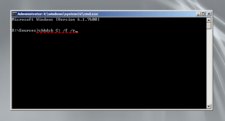 También puede escribir chkdsk C: /f /r para arreglar los errores del disco y luego localizar los sectores defectuosos y recuperar la información legible. Si se le pide que ejecute este comando en el próximo inicio, escriba y y luego reinicie el equipo.