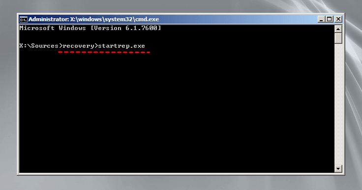 A continuación, en las ventanas del símbolo del sistema, vaya a X:\sources\recovery> startrep.exe. Sólo tiene que esperar hasta que el proceso se complete, que va a resolver los problemas de archivos de registro.