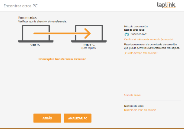 3.Después de que los dos PCs se conecten, haga clic en ANALIZAR PC en el nuevo ordenador. A continuación,haga clic en Elegir lo que se va a transferir junto al botón Siguiente.