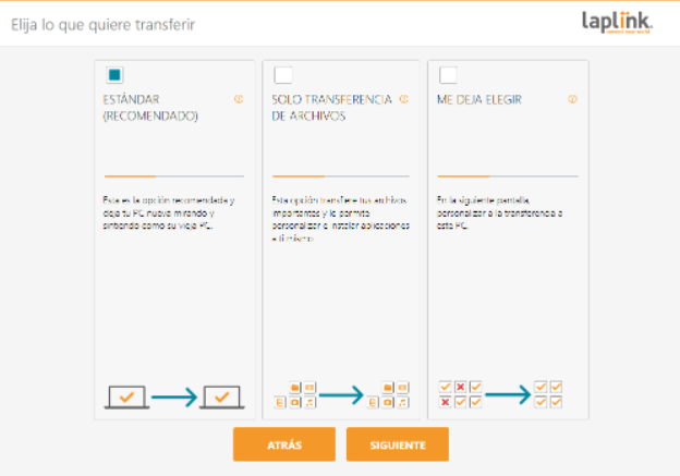 4. Elija una de las tres formas de transferencia: ESTÁNDAR (RECOMENDADO), SOLO TRANSFERENCIA DE ARCHIVOS o ME DEJA ELEGIR, y pulse Siguiente. (elija aquí la primera opción)