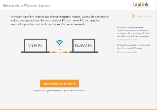 - Ejecute PCmover Express en el nuevo ordenador y haga clic en TRANSFERIR ENTRE PC en la ventana principal,