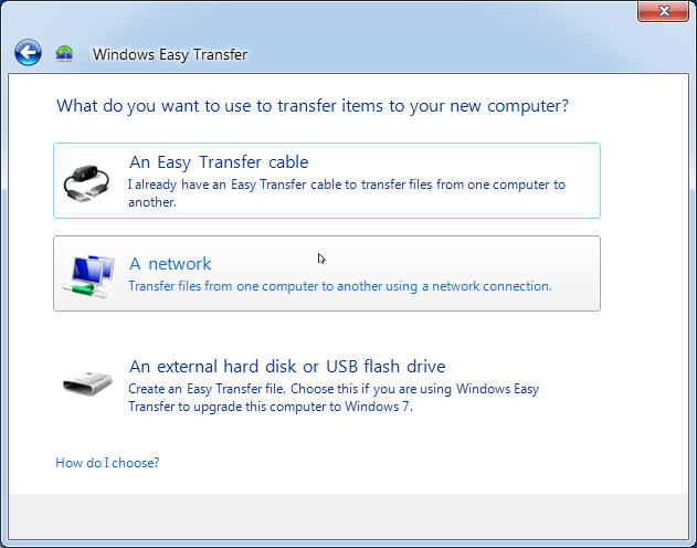2. Elija una forma de transferir los elementos a su nuevo ordenador: Cable USB Easy Transfer(An Easy Transfer cable), Una red (A network), Un disco duro externo o una unidad flash USB (An external hard disk or USB flash drive). Aquí seleccionamos Un disco duro externo o una unidad flash USB.