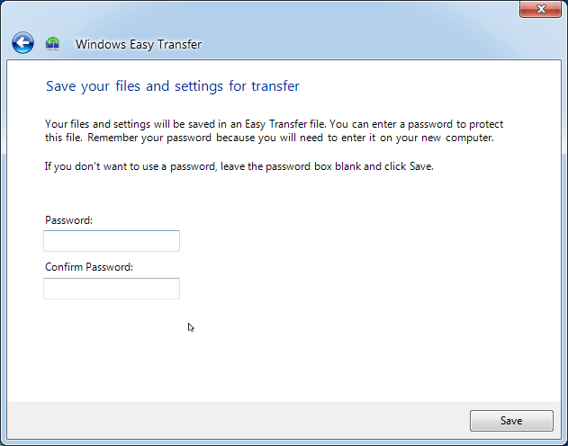 5. Establezca la contraseña para proteger la copia de seguridad o déjela en blanco y haga clic en Guardar (Save) para seleccionar un destino para guardar el archivo denominado Transferencia Fácil de Windows - Elementos de ordenadores antiguos (sufijo con .MIG).