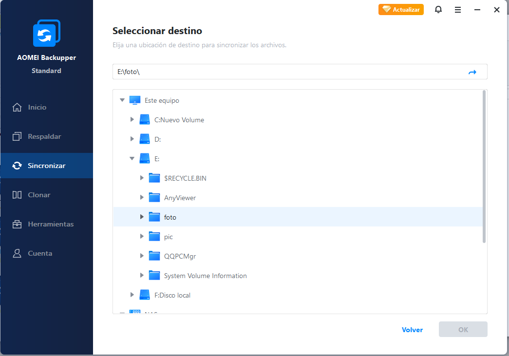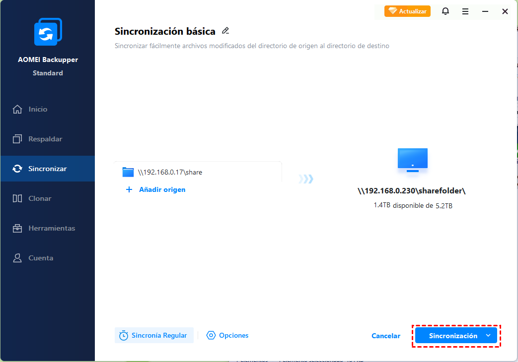 Paso 4. Después de seleccionar el destino de la sincronización, la tarea de sincronización está casi terminada y puedes hacer clic directamente en "Sincronización" para transferir los archivos.