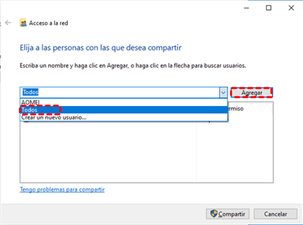 3.2. En la ventana de Compartición de Archivos, seleccione "Todos" en el menú desplegable, haga clic en el botón "Agregar" situado al lado y, a continuación, haga clic en el botón "Compartir".