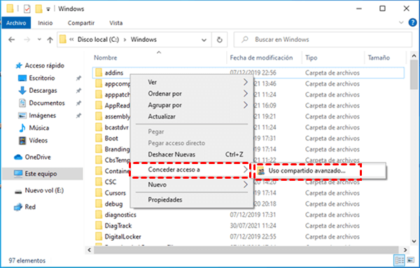 3.1. Selecciona la carpeta que quieres compartir y haz clic con el botón derecho del ratón sobre ella. Elija "Conceder acceso a" y luego seleccione "Uso compartido avanzado...".