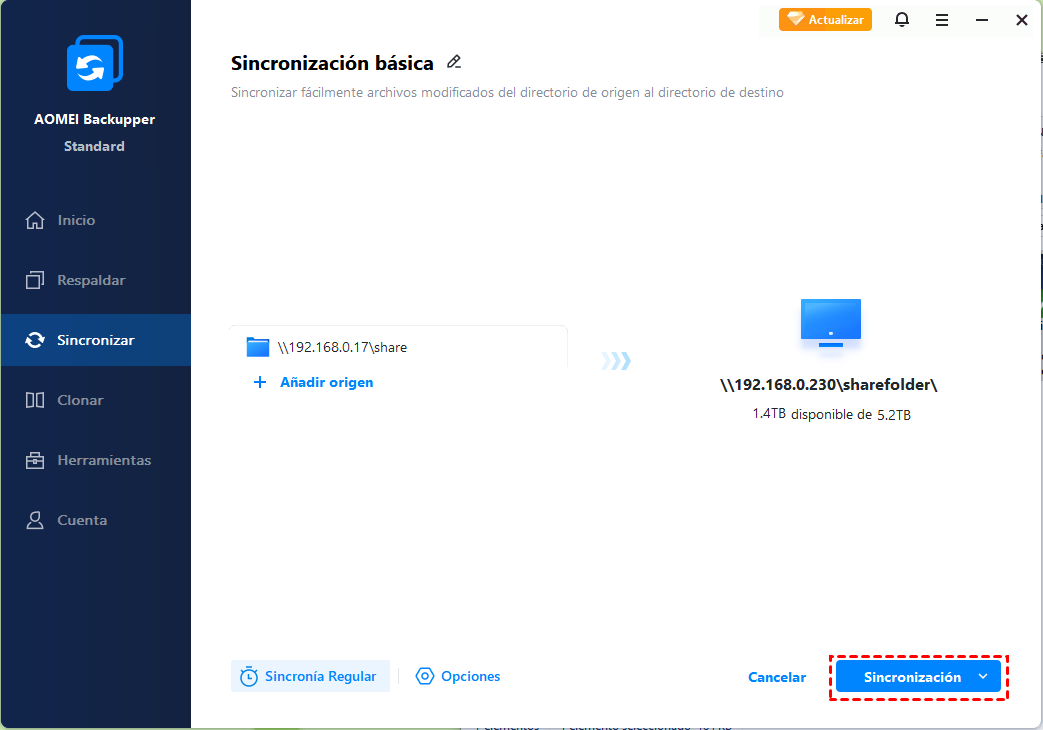 1. Inicie AOMEI Backupper en el ordenador de origen. Haga clic en "Sincronizar" y seleccione "Sincronización básica".