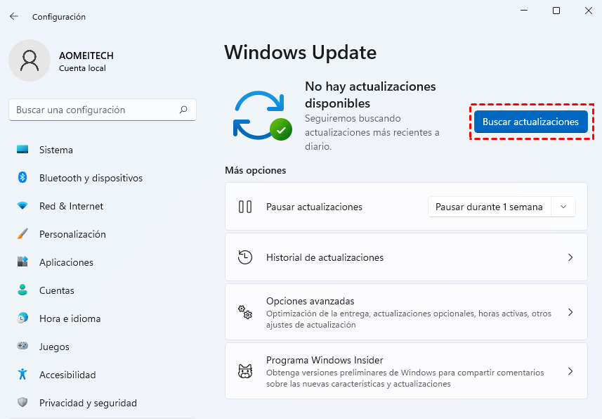 Paso 2. Haz clic en Buscar actualizaciones. Si hay actualizaciones disponibles, descárgalas e instálalas. Luego reinicia tu computadora para ver si el problema ha sido resuelto.