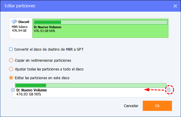 - Ajustar manualmente el tamaño de las particiones: Te permite extender el espacio no asignado a cualquier partición en el disco de destino que desees."