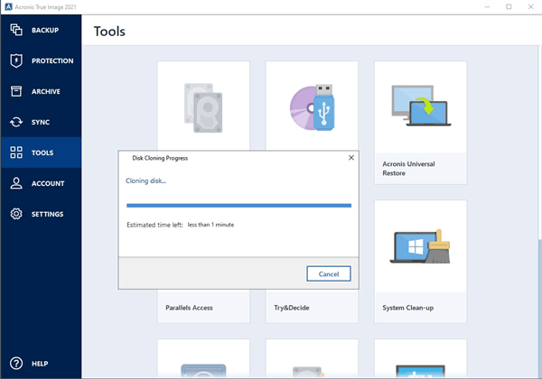 Clonación de Acronis True Image - Atascado en menos de 1 minuto