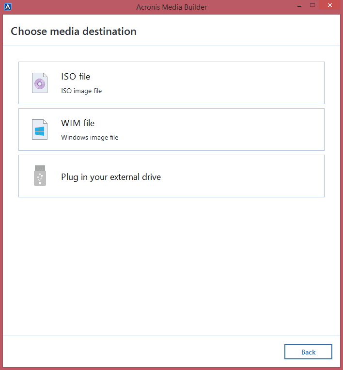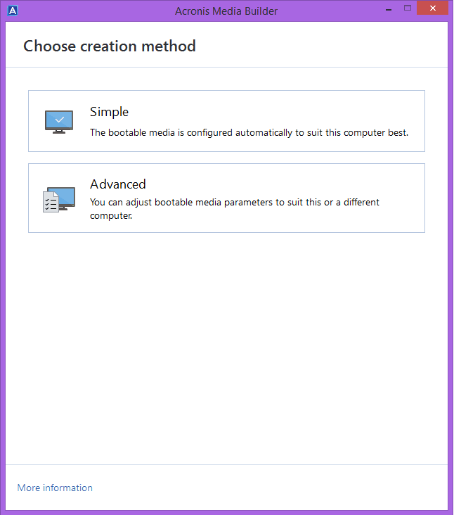 ♨ Sencillo: Esta es la opción más sencilla, adecuada para la mayoría de los usuarios. Acronis True Image elegirá el tipo de medio óptimo para tu computadora. Si utilizas Windows 7 o una versión posterior, se creará un medio basado en WinRE. De lo contrario, el Constructor de Medio de Acronis creará un medio basado en Linux.