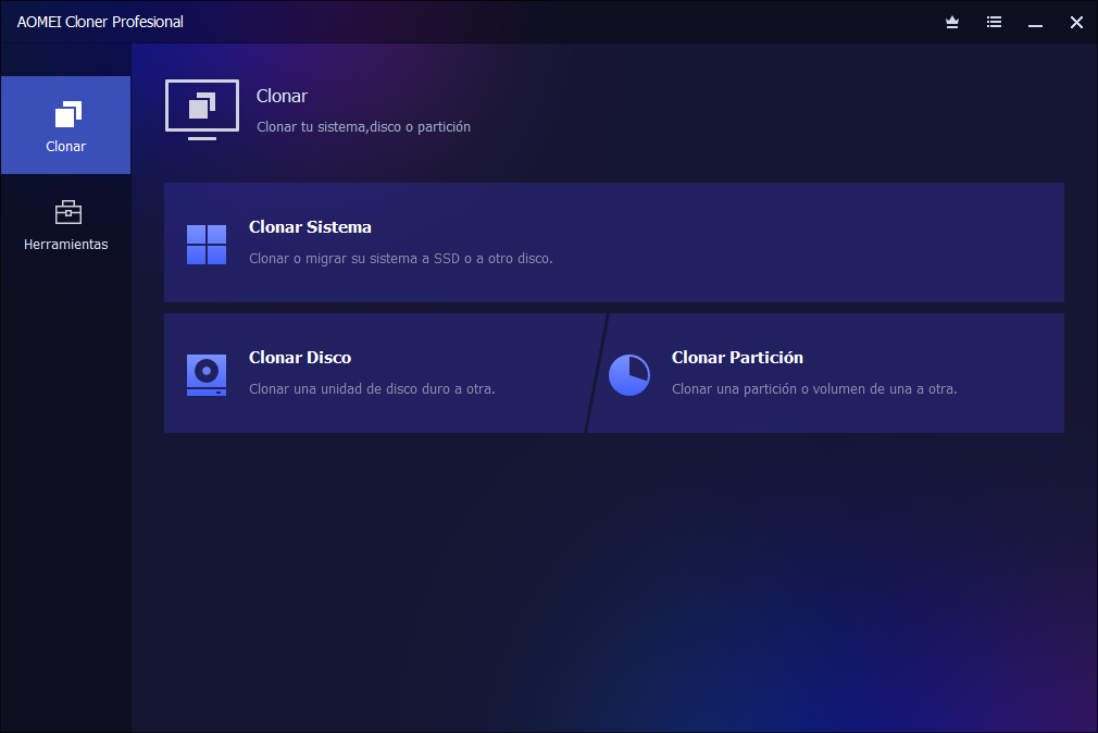 Puede utilizar AOMEI Cloner, una herramienta especializada en clonación de discos. Este software solo admite clonación y creación de medios de arranque, y está diseñado para migrar sistemas o discos completos de forma eficiente.