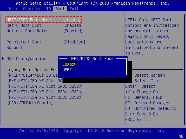 Si necesita clonar MBR a GPT, o viceversa, es necesario cambiar el modo de arranque en consecuencia. Un modo de arranque incorrecto hará que el SSD clonado no arranque. Para cambiar el modo de arranque, es necesario entrar en la BIOS durante el arranque también, a continuación, seleccione el modo de arranque (por lo general en la pestaña de arranque) como Legacy o UEFI.