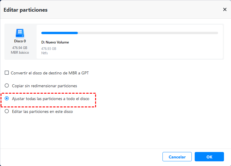 - Ajustar todas las particiones a todo el disco: está seleccionado por defecto para ayudarle a hacer un uso completo del espacio de almacenamiento en la unidad de destino más grande.