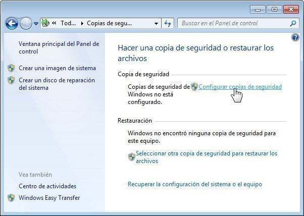 La ruta de Windows 7 a la copia de seguridad es ir a Inicio -> introduce copia de seguridad -> Copia de seguridad y restauración -> Configurar copia de seguridad.