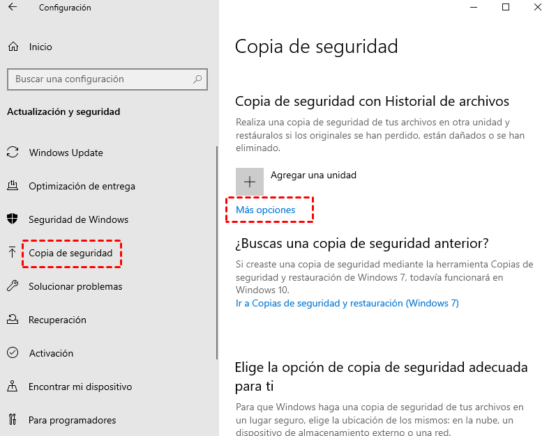 La ruta de Windows 10/11 para hacer una copia de seguridad de sus datos es ir a Inicio -> Configuración -> Actualización y Seguridad -> Copia de seguridad. Hay dos opciones para hacer una copia de seguridad: "Copia de seguridad con Historial de archivos" o "Buscas una copia de seguridad anterior".