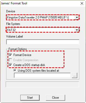Seleccione su unidad USB en Device y FAT32 como sistema de archivos, luego marque las opciones de formato, Format Device y Create a DOS startup disk, seleccione la Boot folder of Boot Norton Ghost haciendo clic en los tres puntos y haga clic en OK. Después de eso, haga clic en Start para montar los archivos del sistema DOS.