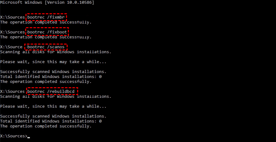 En el Símbolo del sistema emergente, escriba el comando bootrec.exe para iniciar esta herramienta y solucionar el problema del no arranque de Windows 10 con los siguientes comandos.