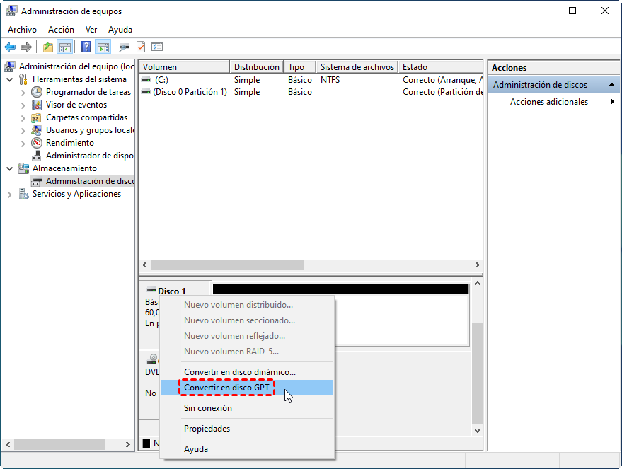 Nota✍: Antes de convertir un disco, haz una copia de seguridad de los datos que contenga y cierra todos los programas que accedan al disco.