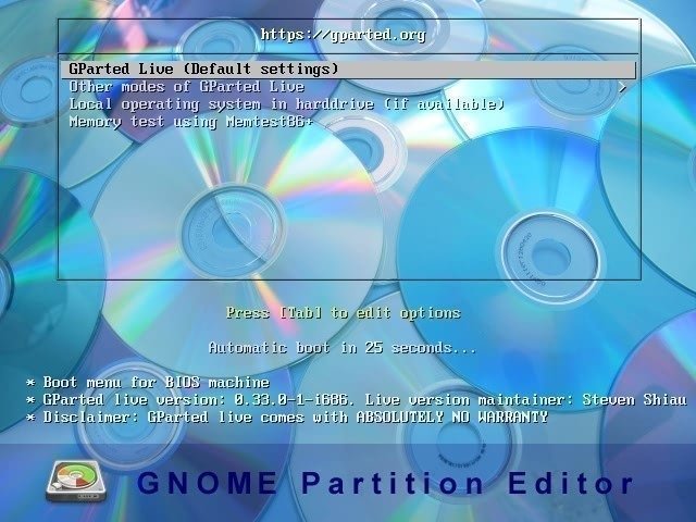 5. Después de las preguntas sobre el mapa de teclas, el idioma y el modo de vídeo, puede empezar a utilizar el programa. Si quieres que GParted clone el disco a un SSD más pequeño, puedes reducir las particiones del antiguo disco duro, haciendo que el tamaño total sea menor que el del SSD.