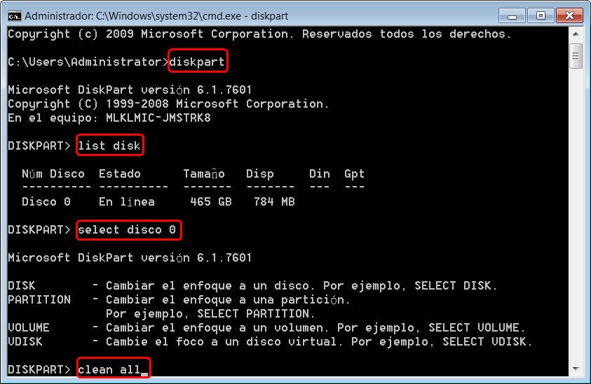 👉 Solución 2: Limpiar el disco de destino mediante el comando clean