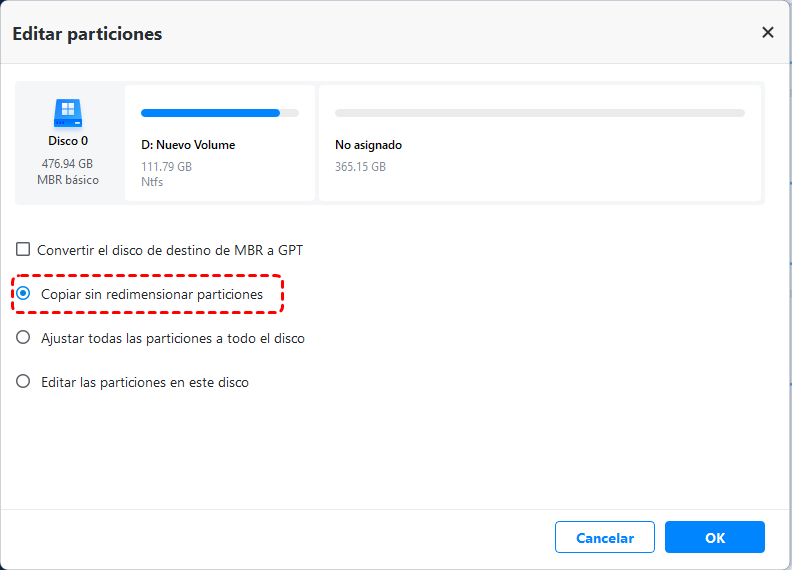 Nota: si el disco de destino es más grande, puede hacer clic en Editar particiones > Ajustar todas las particiones a todo el disco o Editar las particiones en este disco para clonar y cambiar el tamaño del disco duro sin dejar espacio sin asignar al final del disco. Y puede convertir el disco de destino de MBR a GPT si es necesario.