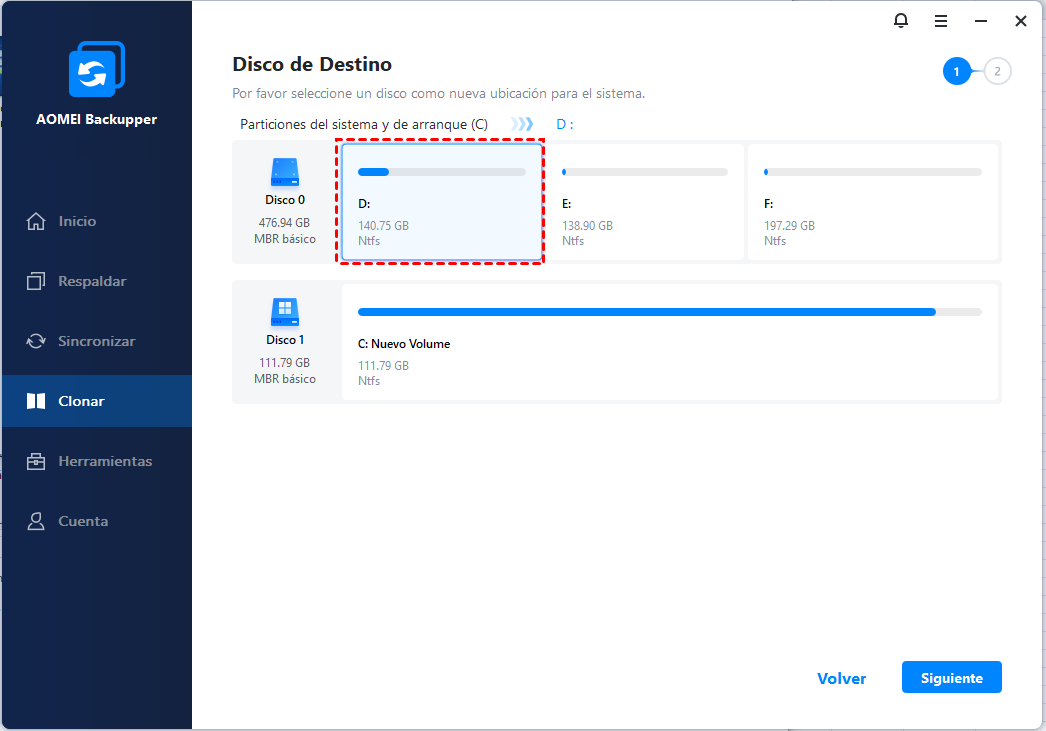 Paso 2. El programa seleccionará automáticamente las particiones de origen, incluida la unidad del sistema operativo y otras particiones requeridas para el arranque. Por lo tanto, solo necesita seleccionar otro disco duro como ubicación de destino (aquí está Disco1) y luego hacer clic en Siguiente.