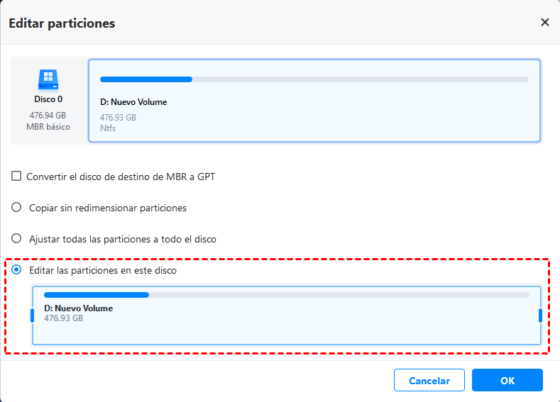 Si necesita convertir el estilo de partición del disco de destino, también puede utilizar la opción Convertir el disco de destino... en "Editar particiones".