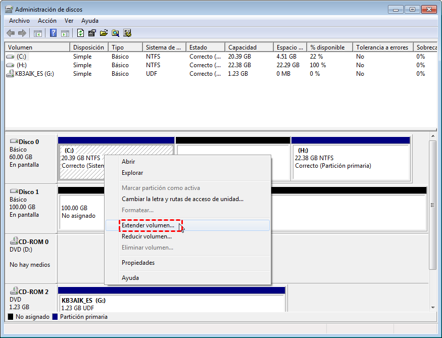 2. Haga clic con el botón derecho en la partición situada a la izquierda del espacio no asignado y seleccione Extender volumen. A continuación, entrará en el Asistente para ampliar volumen, haga clic en Siguiente para continuar.