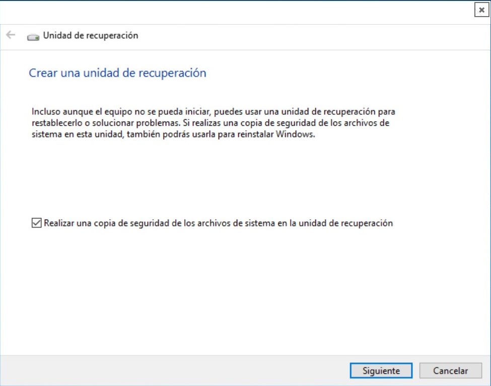 Crear una unidad de recuperación: Conecte un USB con al menos 16 GB de espacio -> busque "unidad de recuperación" -> siga el asistente.