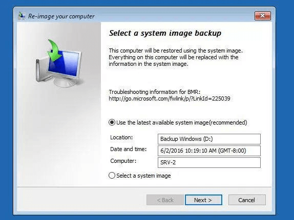 4. En el asistente emergente, compruebe si la última imagen del sistema seleccionada por defecto es la que desea restaurar. Si no lo es, elija Seleccionar una imagen del sistema para especificar la correcta. A continuación, haga clic en Siguiente para continuar.