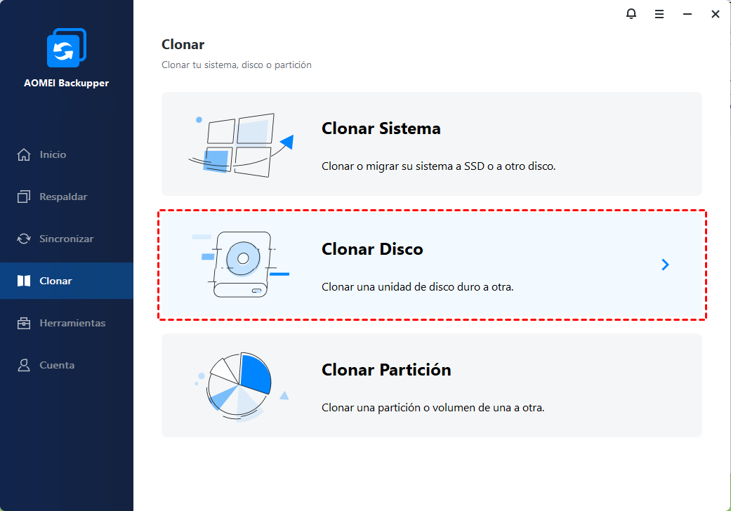 - Clonar Disco: permite clonar todo el disco duro incluyendo todos los volúmenes que contiene. Con él, puede migrar fácilmente discos duros a unidades SSD más pequeñas o clonar unidades SSD a otras más grandes.