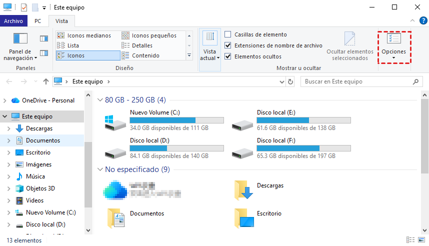 Paso 1. Presiona “Windows + E” para abrir el “Explorador de archivos de Windows”. Luego, haz clic en tu disco duro externo > “Vista” > “Opciones”.