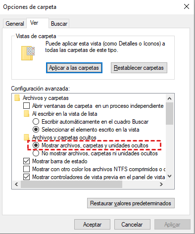 Paso 2. En la pestaña Ver, vaya a la sección "Configuración avanzada" y marque la opción "Mostrar archivos, carpetas y unidades ocultos". A continuación, haga clic en "Aplicar" > "Aceptar".