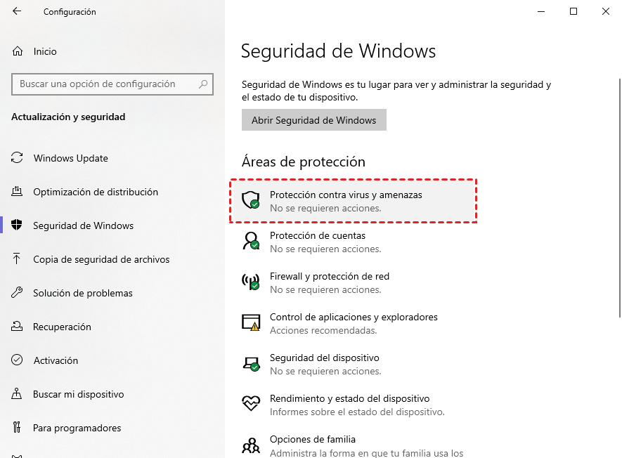 Paso 1. Pulse "Win + I" para abrir la configuración de Windows. A continuación, haga clic en "Actualización y seguridad" > "Seguridad de Windows" y seleccione "Protección contra virus y amenazas".