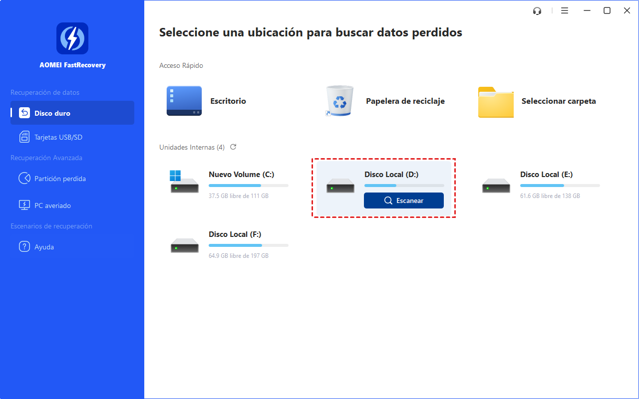 Desarrollado por AOMEI Tech, este software profesional te permite recuperar archivos eliminados/perdidos de SSD, HDD, USB y otros dispositivos de almacenamiento. Admite NFTS, FAT32, exFAT y ReFS en Windows 11/10/8/7 y Windows Server.