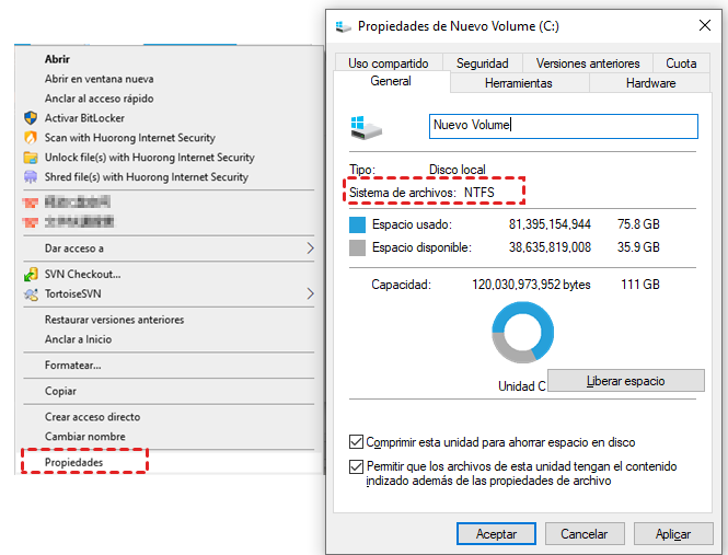 - Verifica tus sistemas de archivos con los siguientes pasos. Haz clic en "Esta PC" y haz clic derecho en tu unidad de origen, luego haz clic en "Propiedades".