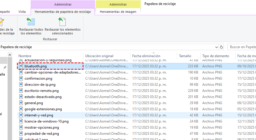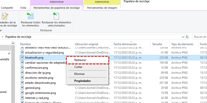 Paso 3. Haz clic derecho en los archivos deseados y luego clic en "Restaurar". También puedes arrastrar los archivos deseados directamente fuera de la papelera de reciclaje.